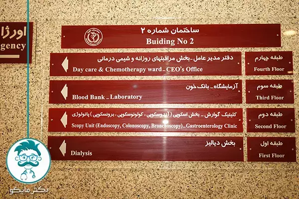 | ساختمان شماره دو | طبقه اول: بخش دیالیز طبقه دوم: بخش آندوسکوپی، بخش پاتولوژی طبقه سوم: آزمایشگاه طبقه چهارم: بخش مراقبت های روزانه، دفتر هیات مدیره |